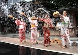 「打ち水大作戦」は、江戸時代の庶民の知恵「打ち水」がヒートアイランド現象に対してどのような効果を持つのか、決められた時間にみんなでいっせいに打ち水をして、その効果を検証しよう、という壮大な社会実験※として2003年からスタートしました。打ち水大作戦本部は、この「いっせい打ち水」の呼びかけを始めとして、日本全国さらには世界で、雨水や2次利用水を活用した打ち水の生活習慣化に向けた活動を行っています。