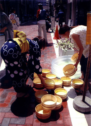 「打ち水準備」 小豆畑欣一郎さん (日時:8/20(金)/場所:中央区銀座8丁目 金春通り) 奈良原一高審査委員長よりコメント: 光が水の清潔感、涼しさを際立たせ、さらに準備時のワクワク感を伝えてくる。桶に反射する光と帯の色も調和しており、静的ではあるが、活き活きとした印象を受ける作品。