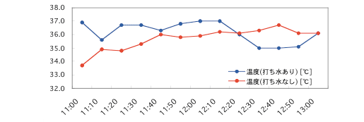 生データ、すなわち測定担当者が温度計(地上から150cmの高さに設置したデジタル湿温計を読み取ったデータ)をそのままプロットした図を以下に示します。ここで、打ち水「あり」と「なし」とは「打ち水をした地点」「打ち水しない地点」のことをいいます。また両測定地点の距離は数mとなっています。