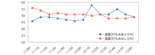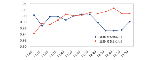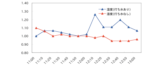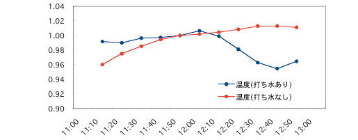 「打ち水なし」の測定は、環境温度・湿度の基準とするために用意したものでした。しかしこの結果のように、打ち水をする以前から差が出てしまっています。温度計の問題、微妙な環境の違いなど、幾つか理由が考えられますが、今後の課題といえるでしょう。 そのため、両者の温度の差を補正する作業が必要となりました。打ち水開始が12時ちょうどですので、その一つ前のデータである11時50分を基準としてみます(図2)。縦軸の目盛りは、打ち水の「あり」「なし」それぞれについて、11時50分の値を基準としたものです。