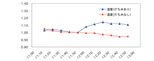どうですか、今度は何か見えてきたと思います。 まず図2(a)の温度変化を見てみましょう。11時から12時までの間、徐々に温度が上がってきています。これは純粋に日射量の上昇によるものでしょう。多少の温度のばらつきは、時々刻々と変化する環境の温度を、わずか10分に1回のタイミングで測るという状況に起因するものと思われます。 打ち水後の12時10分のデータは、一見「打ち水なし」の方が温度が高いように見えますが、誤差の範囲と思います。そしてその後、急激に両者に差が現れました。「打ち水なし」の場合はほとんど変化がないので、この「打ち水あり」の結果は、環境温度の変化ではなく、純粋に打ち水の効果であるといえるでしょう。実際、湿度がほぼ同様のタイミングで増加していることからもそれがいえると思います。 さて、差がもっとも大きい12時40分についてですが、この差はおよそ0.08です。これは、温度に換算し直すと、図1(a)の「打ち水なし」の11時50分の値である36度を利用した場合、36℃×0.08=2.9℃であるという結果となりました。 なお参考までに、図3に3点平均の結果を示します。これは、隣り合う3つのデータの平均をプロットするもので、ばらつきの大きいデータから傾向を読み取る手法です。これにより、先に示した打ち水の効果がはっきりと分かると思います。