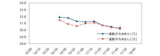 横綱通り 日にち:8/24(火) 測定時間(打ち水開始時刻):16:30〜17:40(17:00) 打ち水した水の量: 最大温度変化:約0.6 ℃ 結果 : 成功! コメント:昼間と違う傾向がはっきり。