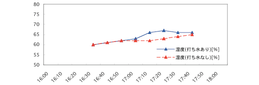 「効果が分かりやすい図2で分析してみましょう。 まずは温度に関して、打ち水の効果ははっきり出ています。17時30分で打ち水「あり」「なし」の差が最大で、およそ0.6℃の低下になっています(打ち水のない場合の16時50分の値が正しいとすると、17時30分での差が0.02なので、30.6℃×0.02=0.6℃)。少し効果が低かったようですが、この時間帯ですから、実は十分なのかもしれません。人工ではなく自然の調整能力による効果かも?