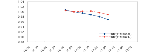 図1に測定結果そのままの生データ(すなわち測定担当者が温度計(地上から150cmの高さに設置したデジタル湿温計を読み取ったデータをそのままプロットした図)を、また図2に補正後(打ち水前の16時50分で「打ち水なし」と「打ち水あり」をそれぞれ規格化して、さらに3点間の平均をとったもの)のデータを示します。(ここで、打ち水「あり」と「なし」とは「打ち水をした地点」「打ち水しない地点」のことをいいます。また両測定地点の距離は数mとなっています。)