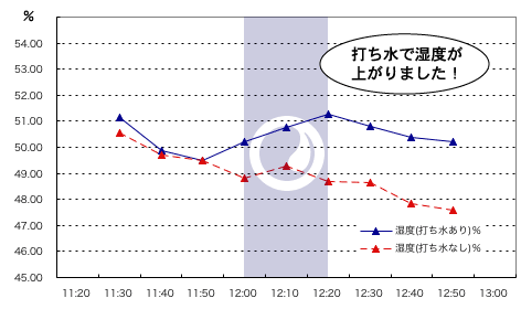 ・また湿度も打ち水によって変化し、その最大差は2.6%(12:20)でした。
