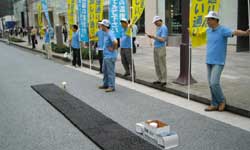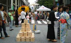 普通アスファルトと断然違う!道路遮熱性舗のPR ハッピ姿の男衆は準備に大忙し、水は高度処理水。 "番傘付移動観測体"による気温、湿度測定 銀座通りに積み上げられた木桶の山。開始を待つ。 カウントダウンの合図とともに打ち水開始! 老いも若きも打ち水にいっしょに興じる。 写真には写らなかったけど、銀座の空にとんぼの群れ。